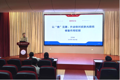 王玉帅博士应邀作题为《以“微”见著:外泌体对皮肤光损伤修复作用初探》的学术报告,为在场师生带来了一场内容详实、见解独到的学术分享。报告中,王博士系统梳理并介绍了该领域的最新研究进展,层层深入、逻辑清晰。本次讲座不仅加深了师生对外泌体相关研究的理解,更有力地激发了大家的科研兴趣与探索热情,有效促进了学术思想的交流与碰撞,获得一致好评。