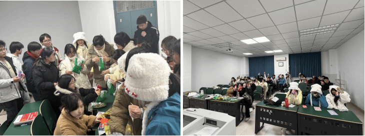 活动前,班委精心布置教室,并准备了丰富的游戏奖品与手工材料,包括数字游戏优胜者奖品洗衣液、“你画我猜”纪念书签,以及香囊制作所需的艾叶、茯神等中药材。
