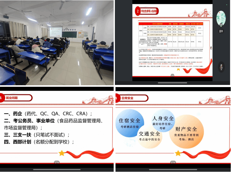 为拓宽毕业生发展视野,会议还设置了征兵政策与就业方向解读环节。夏老师详细介绍了2026年大学生入伍条件、流程及优待政策,特别是药学专业在军队医疗系统中的发展优势,鼓励符合条件的同学踊跃报名。此外,他还梳理了公务员、事业单位、“三支一扶”等就业渠道的关键时间节点,帮助大家明晰规划。