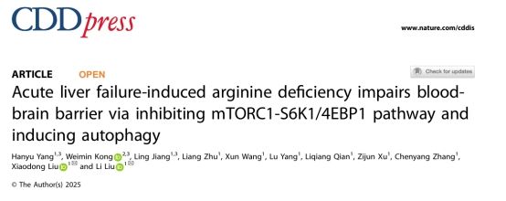 近日,在线下注 孔维敏博士作为共同第一作者,与中国药科大学在线下注 刘晓东/刘李教授团队合作,在权威期刊《Cell Death and Disease》(中科院生物学1区Top,IF=9.6)上在线发表了题为“Acute liver failure-induced arginine deficiency impairs blood brain barrier via inhibiting mTORC1-S6K1/4EBP1 pathway and inducing autophagy”的研究性论文。