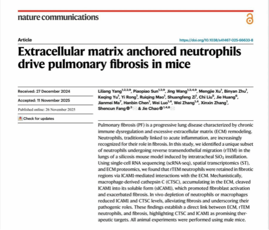 肺纤维化是一类以肺组织结构不可逆重塑和呼吸功能进行性下降为特征的严重慢性肺疾病,其中矽肺等职业相关肺纤维化对劳动人群健康造成长期危害,但其关键致病细胞来源及病理微环境调控机制尚未完全阐明。免疫细胞与细胞外基质(extracellular matrix,ECM)之间的异常互作被认为是推动纤维化持续进展的重要因素,但缺乏直接的细胞学与空间层面证据。本研究通过多组学及体内外功能实验,系统揭示了一类与细胞外基质高度锚定的中性粒细胞亚群在肺纤维化进程中的关键致病作用。研究发现,该类中性粒细胞在纤维化病灶区域呈现显著空间富集特征,并通过持续释放促纤维化信号分子,显著激活成纤维细胞并促进胶原沉积,从而加速肺组织结构重塑和肺功能损伤。该发现突破了传统将中性粒细胞视为“短暂炎症反应细胞”的认知,提出其在慢性纤维化疾病中具有持续、结构性调控作用的新机制。